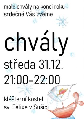 Už můžeme pomalu mluvit o malé sušické tradici: poslední den v roce se scházíme v klášterním kostele sv. Felixe na silvestrovských chválách. O co jde? Přes písně vyjadřujeme vděčnost za dobré věci a situace, které nás potkaly. Předkládáme Bohu i smutek, jenž nás zasáhl. A zároveň prosíme o požehnání do roku nového. Pokud byste se chtěli zúčastnit, můžete k nám zavítat ve 21 h. O hudební doprovod se postarají sušické Malé chvály, které pravidelně doprovázejí sobotní liturgii u Sv. Václava. Celá akce potrvá asi hodinu.