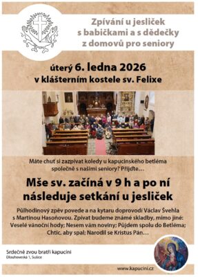 O slavnosti Zjevení Páně, lidově na Tři krále, tedy v úterý 6. ledna 2026, bude sloužena v klášterním kostele sv. Felixe mše svatá v 9 h. Proč v takový nezvyklý čas? Protože k nám přijde mimořádná návštěva: babičky a dědečci ze sušických domovů pro seniory. Za ně se také budeme při liturgii modlit. Bohoslužba odstartuje začátek našeho setkání, které bude pokračovat zpěvem u jesliček.