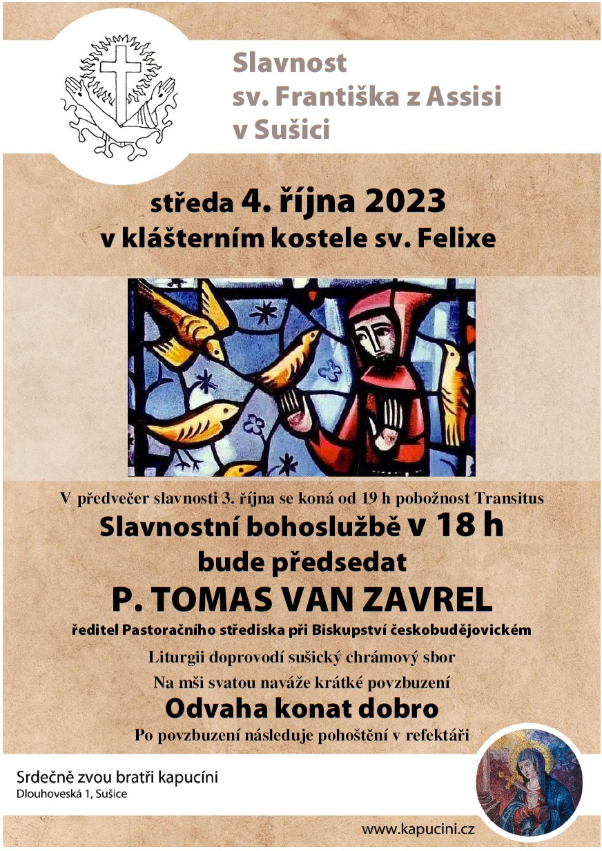 Ve středu 4. října 2023, o slavnosti sv. Františka z Assisi, přivítáme v Sušici o. Tomase van Zavrela, ředitele Pastoračního střediska při Biskupství českobudějovickém, který “v našich končinách” před časem i působil. O. Tomas bude předsedat mši svaté v 18 h, po ní pak bude mít v kostele sv. Felixe povzbuzení s názvem “Odvaha konat dobro“. Všichni jsou potom zváni na malé pohoštění do refektáře.