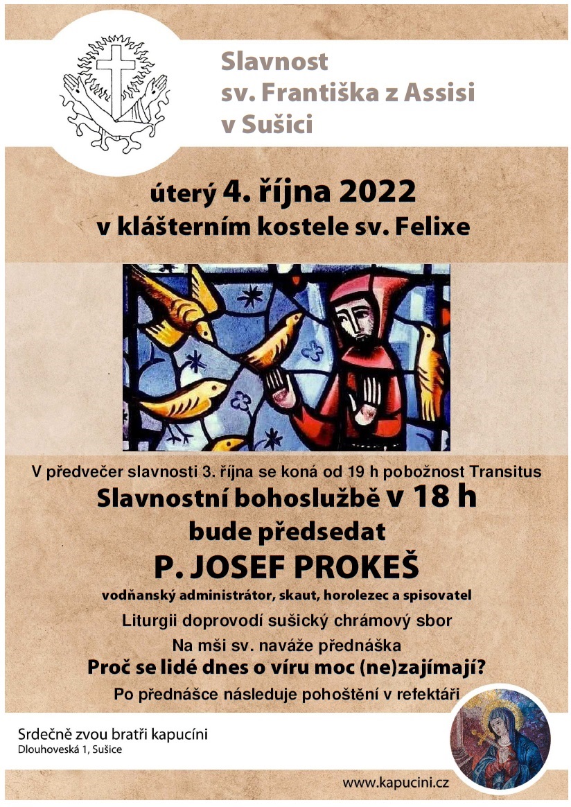 Zvláště upozorňujeme na přednášku o. Josefa Prokeše na téma „Proč se lidé dnes o víru moc (ne)zajímají?“ – přednáška naváže na slavnostní bohoslužbu.