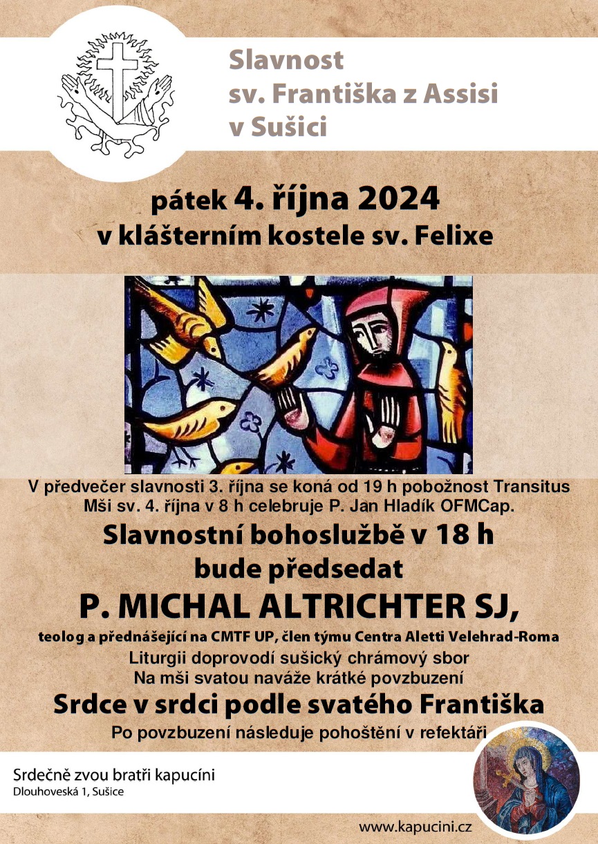 V pátek 4. října můžete navštívit i ranní bohoslužbu v 8:00. Celebrovat ji bude br. Jan OFMCap. Po mši sv. budou následovat litanie k Srdci Ježíšovu. Ve pátek tedy nebude bohoslužba v děkanském kostele sv. Václava. Všichni jste zváni na slavnost do kláštera. Za zprostředkování obrázku sv. Františka na plakátu níže děkujeme portálu rts.ch.