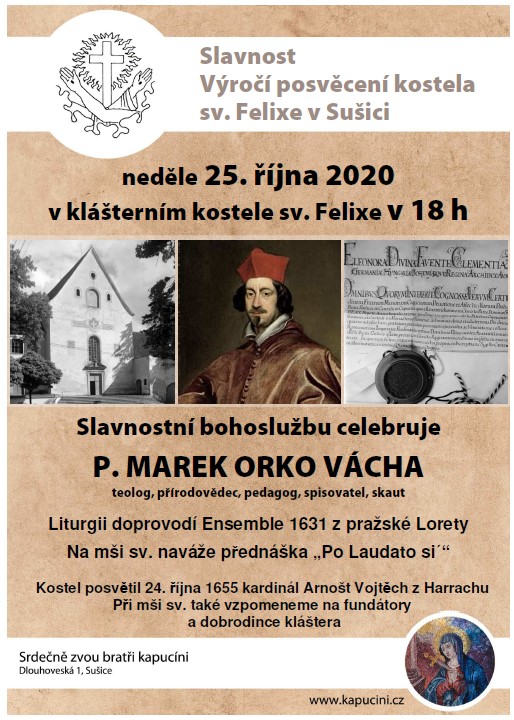 Slavnostní bohoslužbu ke 365. výročí posvěcení kostela kardinálem Arnoštem Vojtěchem z Harrachu měl celebrovat P. MAREK ORKO VÁCHA – teolog, přírodovědec, pedagog, spisovatel a skaut. Liturgii doprovodí Ensemble 1631 z pražské Lorety. Na mši sv. měla navázat přednáška „Po Laudato sí“.