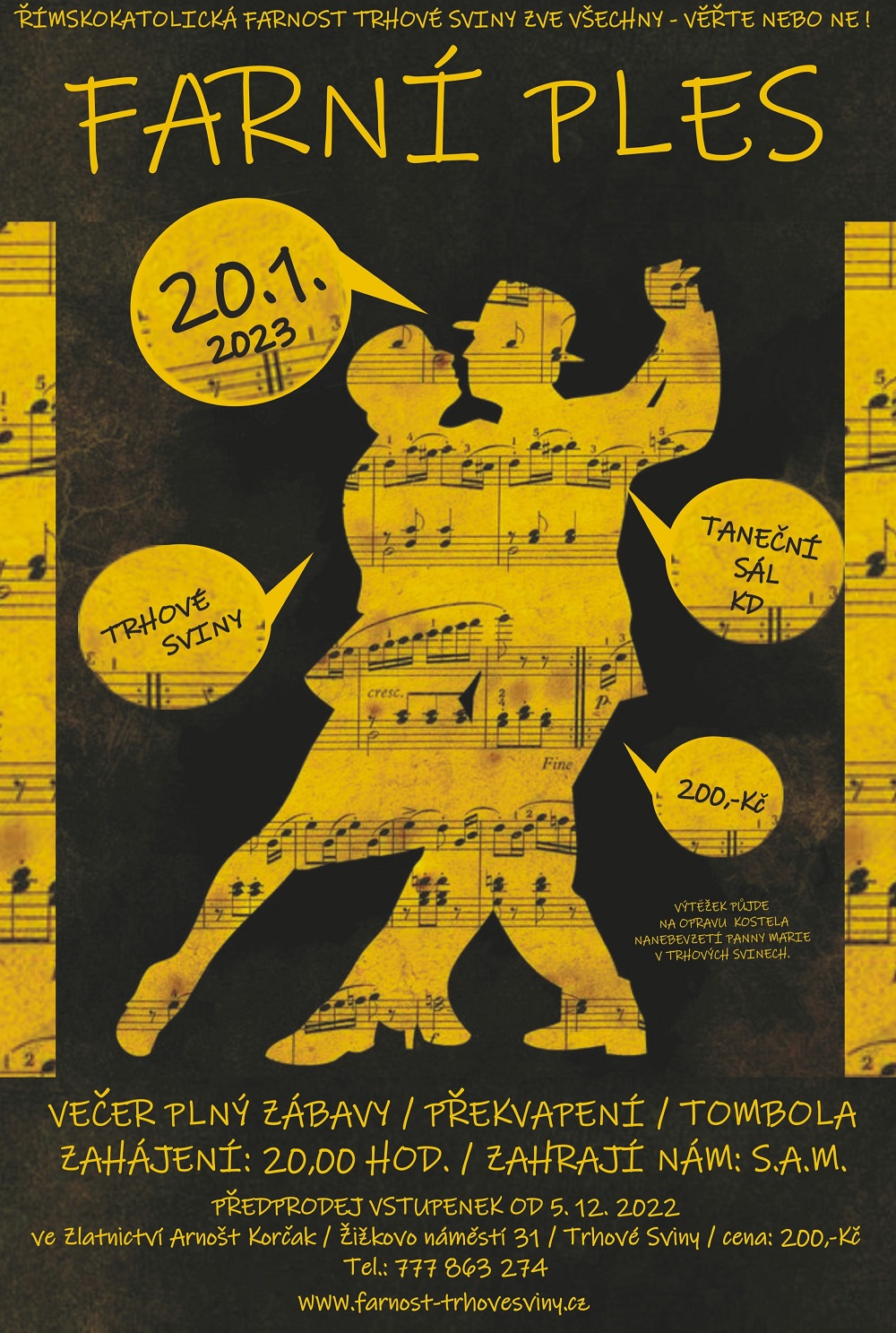 Římskokatolická farnost Trhové Sviny zve všechny – věřte nebo ne – na večer plný zábavy s překvapením. Výtěžek plesu půjde na opravu kostela Nanebevzetí Panny Marie. Vstupenky zakoupíte už teď ve Zlatnictví Arnošt Korčak, Žižkovo náměstí 31, Trhové Sviny – telefon 777 863 274.