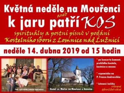 V neděli 14. dubna 2019 v 15 hodin Vás srdečně zveme na Mouřenec na pořad Květná neděle na Mouřenci aneb k jaru patří KOS. Těšit se můžete na spirituály a postní písně v podání Kostelního sboru z jihočeské Lomnice nad Lužnicí. Tento soubor nám k nám před 6 lety přivezl právě onu Popelku nazaretskou.