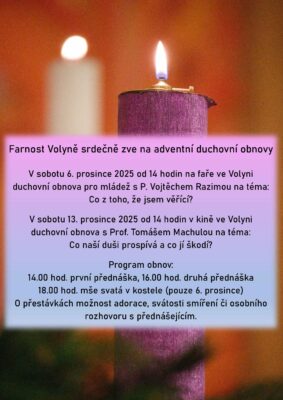Volyně: Duchovní obnova pro mládež s P. Vojtěchem Razimou Události v diecézi Datum od: 6.12.2025 14:00 Datum do: 6.12.2025 19:00 Místo: Fara Volyně Facebook Twitter