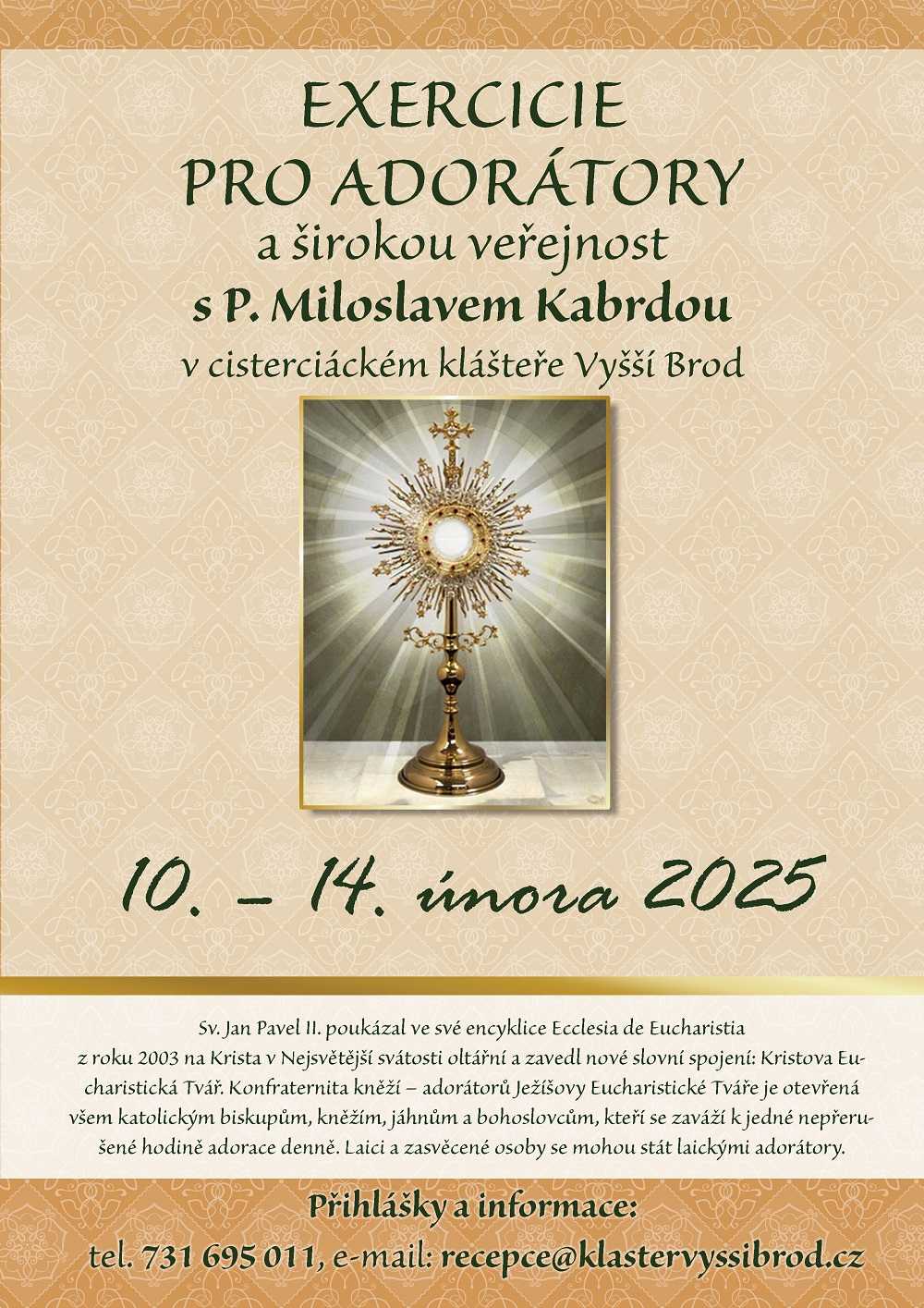 VYŠŠÍ BROD: Exercicie pro adorátory 2025 Události v diecézi Datum od: 10.2.2025 09:00 Datum do: 14.2.2025 15:00 Místo: Klášter Vyšší Brod Facebook Twitter