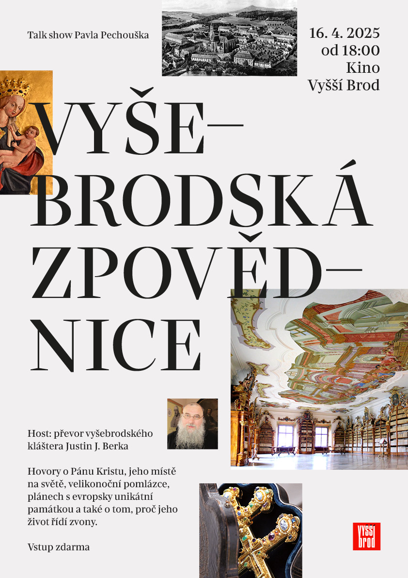 Převor vyšebrodského cisterciáckého kláštera Justin Berka bude prvním hostem nové talk show „Vyšebrodská zpovědnice“ ve vyšebrodském kinosále. Bude vyprávět nejen o plánech s klášterem, ale i o tom, proč si zvolil svou Boží cestu, a nikoliv nějakou mnohem jednodušší. Pavel Pechoušek bude moderovat rozhovor s převorem Justinem o Pánu Kristu, o jeho místě na světě, velikonoční pomlázce, o dalších plánech s evropsky unikátní památkou a také o tom, proč život převora Justina řídí zvony.