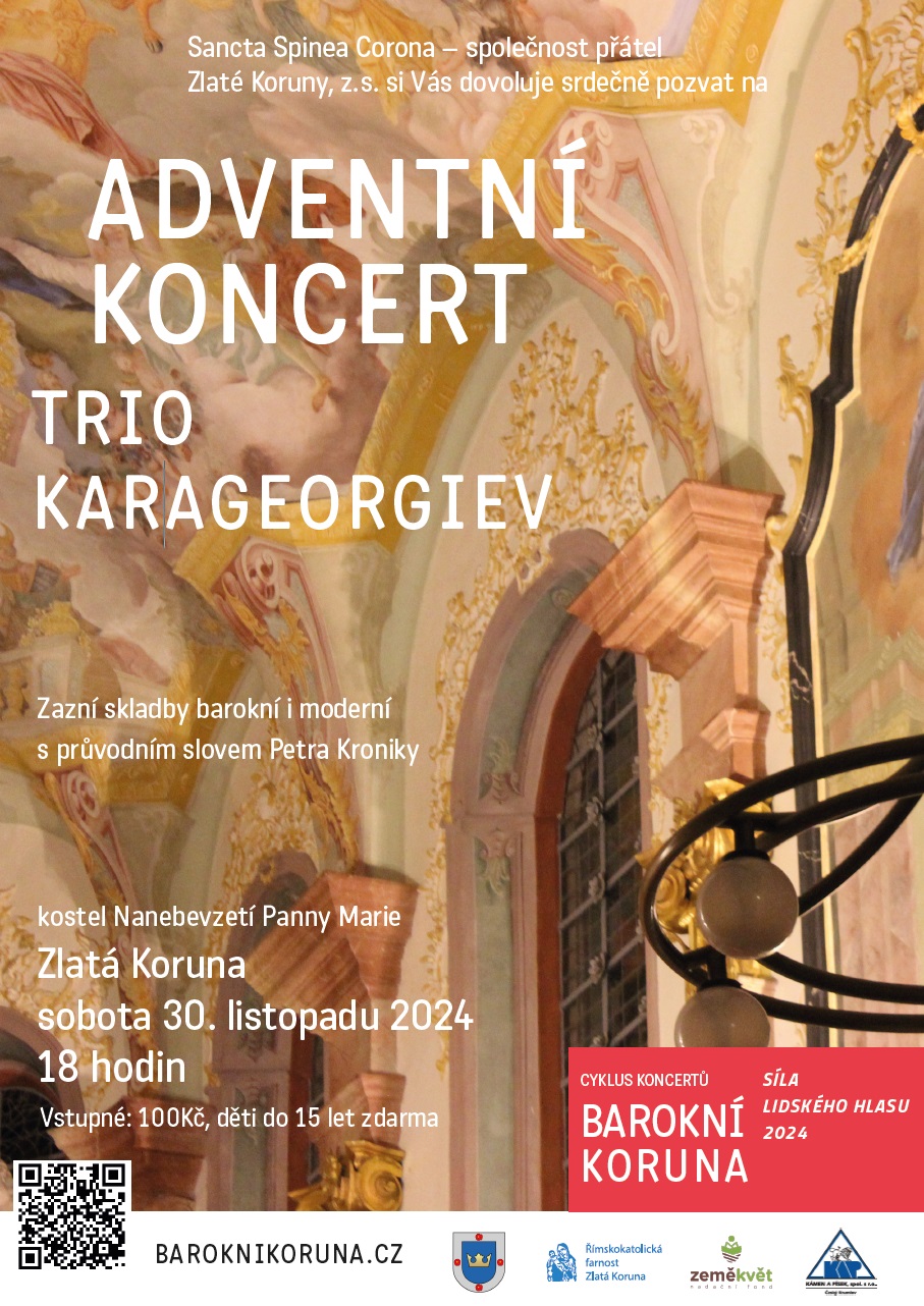 Při adventním koncertu dáváme pravidelně prostor mladým talentům. Je podivuhodné, kolik máme ve svém nejbližším okolí nadaných hudebníků! Tentokrát to bude Trio Karageorgiev z nedalekého Třísova, jehož členové vystudovali brněnskou JAMU. Vystoupili na mnoha koncertech a festivalech u nás i v zahraničí, dokonce měli tu čest hrát i pro dánskou královnu. Věříme, že i ve Zlaté Koruně nám přichystají vpravdě královský zážitek.
