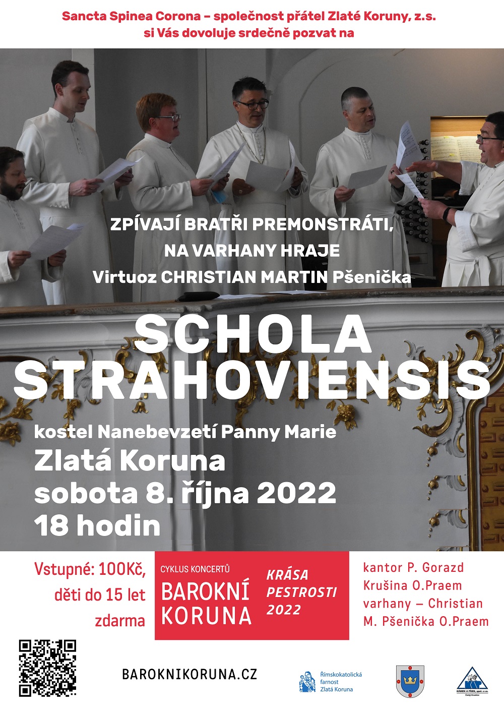Společnost přátel Zlaté Koruny si dovoluje srdečně vás pozvat na koncert duchovní hudby. Pod vedením MgA. Christiana Martina Pšeničky vystoupí Schola Strahoviensis, v jejímž podání zazní skladby sólové i díla pro scholu a varhany. Budeme se moci zaposlouchat do skladeb např. Girolama Frescobaldiho, Johanna Sebastiana Bacha, Dietricha Buxtehudeho a dalších autorů.