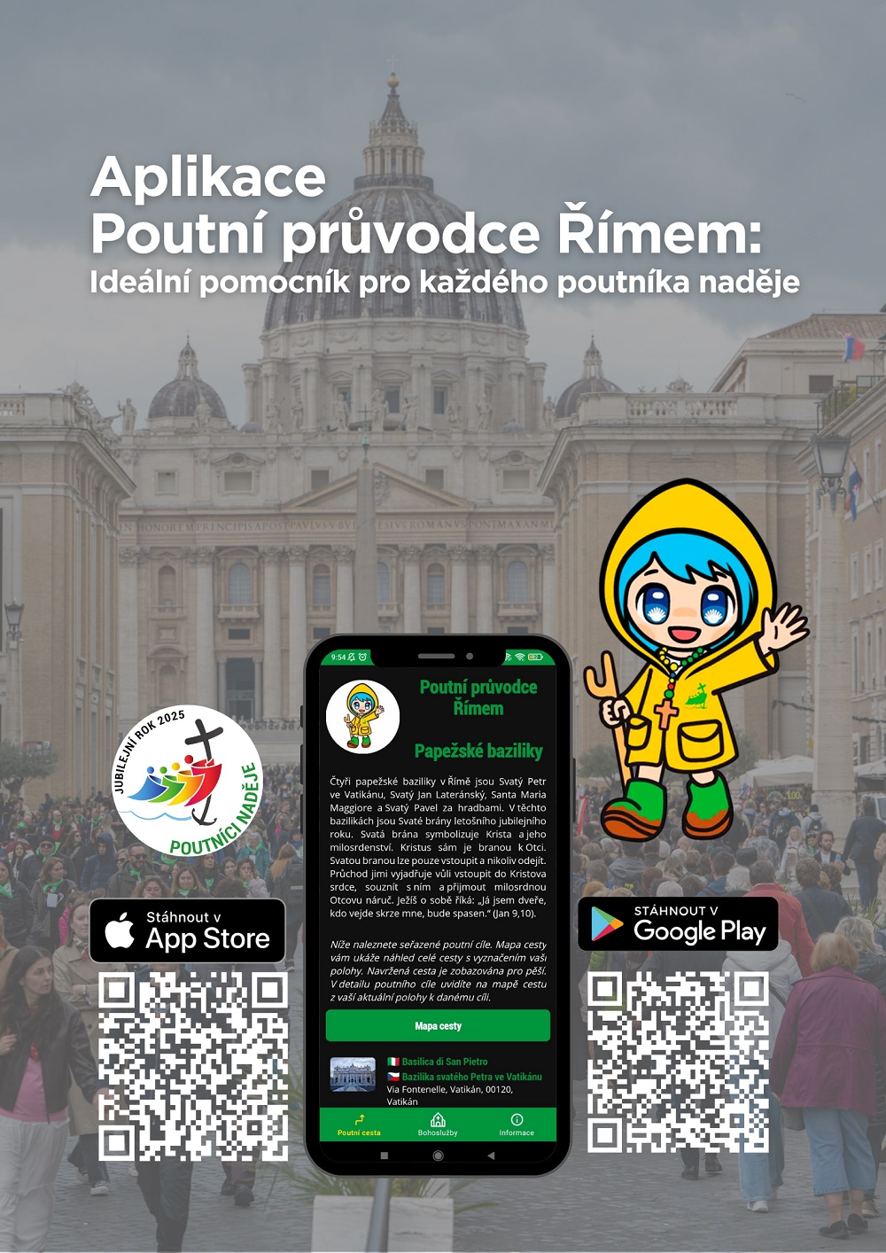 Poutníci mohou k pouti ke svatým branám do Říma využít mobilní aplikaci „Poutní průvodce Římem“. Aplikace nabízí podrobné informace o čtyřech hlavních papežských bazilikách: sv. Petra ve Vatikánu, sv. Jana Lateránského, Santa Maria Maggiore a sv. Pavla za hradbami. Součástí aplikace jsou texty k modlitbě, které pomohou poutníkům na jejich duchovní cestě. Pro všechny, kdo se účastní liturgie, jsou v aplikaci k dispozici latinské a italské odpovědi na mši svatou, což usnadní orientaci při účasti na bohoslužbách v Římě. Aplikace je k dispozici ke stažení pro zařízení Android na Google Play a pro iPhone v App Store. Níže je plakát k vyvěšení na farním webu nebo k tisku pro nástěnku.