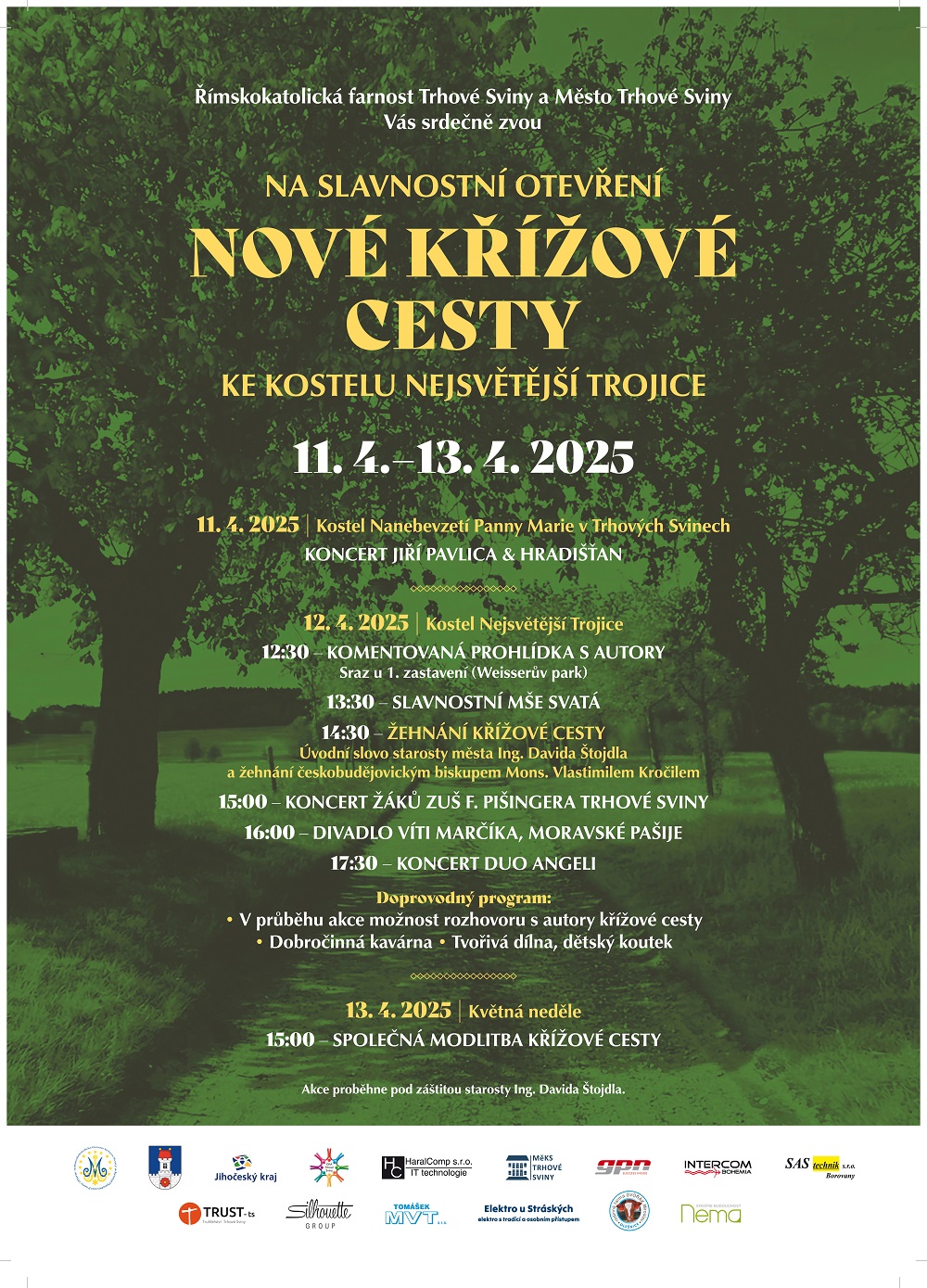 Město Trhové Sviny ve spolupráci s Římskokatolickou farností Trhové Sviny vás srdečně zvou na slavnostní otevření křížové cesty. Předehrou bude v pátek 11. dubna od 18:00 hodin koncert Jiřího Pavlici & Hradišťanu v kostele Nanebevzetí Panny Marie v Trhových Svinech. V sobotu 12. dubna se můžete těšit především na komentovanou prohlídku křížové cesty s autory. Sraz zájemců bude u zastavení č. 1 ve Weyszerově parku v Trhových Svinech ve 12:30. Následovat bude slavnostní mše svatá od 13:30 hodin v kostele Nejsvětější Trojice a žehnání křížové cesty od 14:30 u kostela. Křížovou cestu požehná českobudějovický biskup Mons. Vlastimil Kročil. Celý program je uveden v plakátu níže.