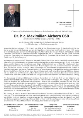 Dr. h.c. Maximilian Aichern OSB, emeritní biskup diecéze Linec (1982 – 2005), odešel 31. ledna 2026 ve věku 94 let posílen svátostmi církve domů k Pánu Bohu.