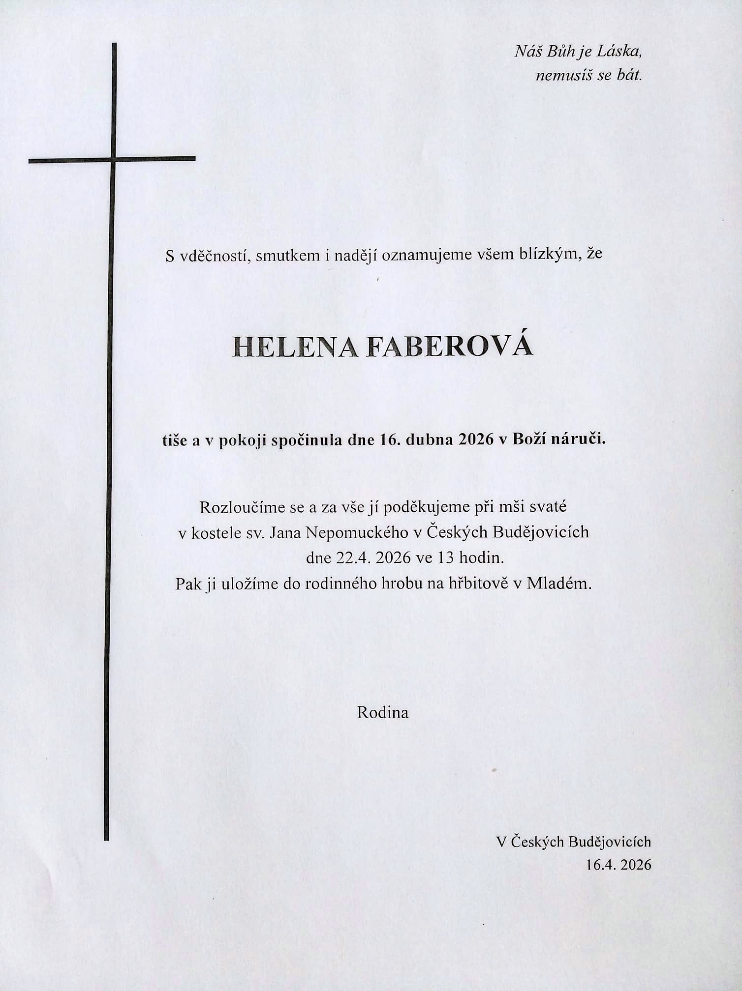 Ve věku devadesáti let zemřela ve čtvrtek 16. dubna 2026 zakladatelka Diecézní charity České Budejovice paní Helena Faberová. Helena Faberová (1935) se narodila v Praze, ale většinu svého života prožila spolu s manželem Karlem v jižních Čechách, od roku 1970 pak přímo v Českých Budějovicích. Již v mládí dokázala statečně čelit komunistickému útlaku a jejího ducha statečnosti mohli poznat i mnozí mladí křesťané, pro které byl dům rodiny Faberů dobrou školou a často i útočištěm. Téměř dvacet let pracovala na Biskupství českobudějovickém a v roce 1990 se stala zakladatelkou a první ředitelkou Diecézní charity České Budějovice. Její práce se však neomezovala pouze na organizování charitativní činnosti. Velkou měrou se rovněž zasloužila o usmiřování Čechů s Němci, zvláště poté, kdy založila českou pobočku »Ackermann-Gemeinde«, tedy sdružení, v jehož čele stála jako předsedkyně několik let. Pracovala také v Unii katolických žen a založila projekt »Magdala« věnující se pomoci ženám, jež se staly součástí nucené prostituce. V roce 2017 jí diecézní biskup Mons. Vlastimil Kročil udělil zlatou medaili sv. Auraciána za zásluhy při šíření křesťanských hodnot a mimořádné přispění k rozvoji života diecéze.